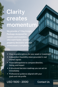 Melalui 7-Day Insight Package, kami membantu klien melihat gambaran besar dalam waktu singkat — tanpa proses yang rumit. Pendekatan ini dirancang untuk memberikan ringkasan jernih mengenai kondisi aset, potensi, serta arah terbaik yang bisa diambil dalam waktu tujuh hari.